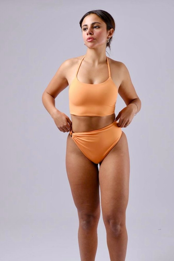 סט בגד ים דגם שירה המציע מספר סגנונות לבישה במוצר אחד בד לייקרה צבע כתום.